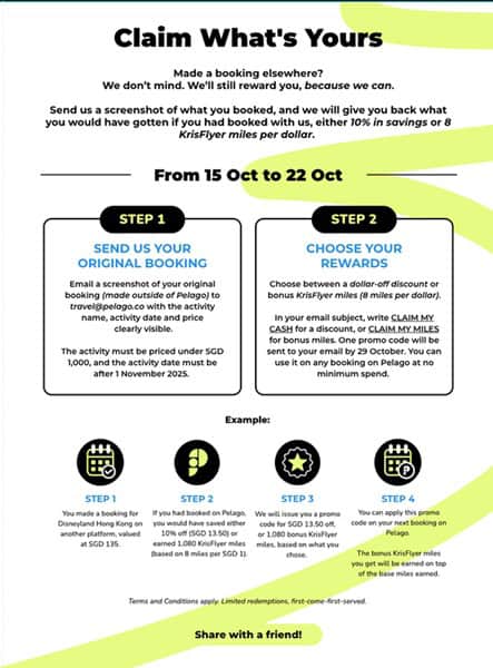 From 15–22 Oct, travellers who booked an activity anywhere else on a non-Pelago platform can email Pelago a screenshot and receive either 10% in savings or 8 KrisFlyer miles per dollar as a promo code for their next Pelago booking.