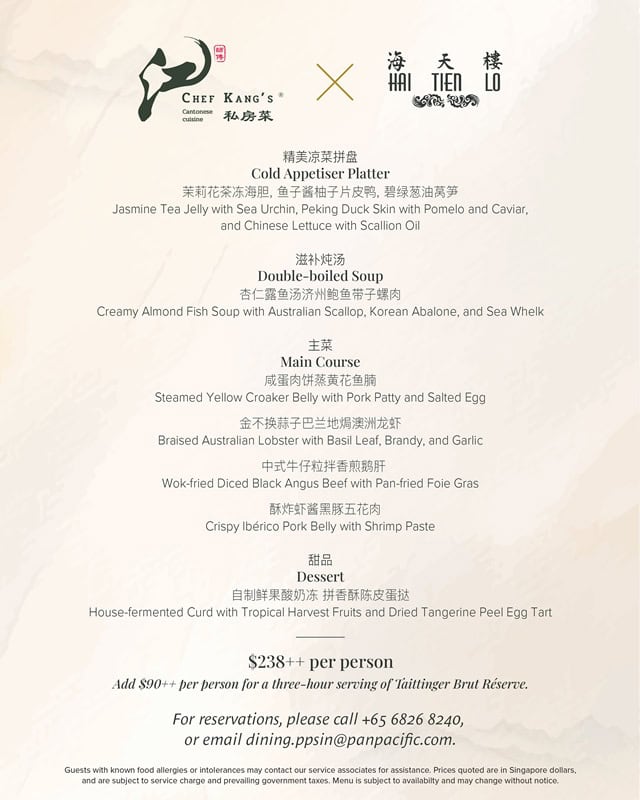 Widely regarded as one of Singapore’s most influential masters in Cantonese cuisine, Chef Kang, together with Hai Tien Lo’s Executive Chinese Chef Edden Yap, will present a seven-course menu showcasing both Chefs’ classic favourites, priced at $238++ per person. To elevate the experience, a three-hour serving of Taittinger Brut Réserve is available at an additional $90++ per person.