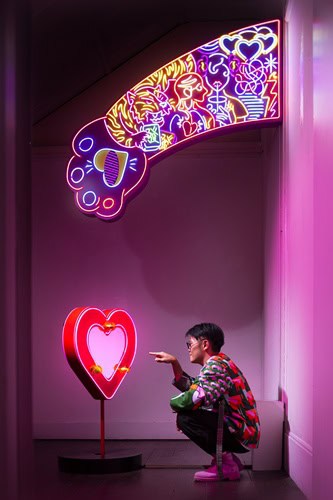 Roy Wang: The installation draws from everyday happiness. A cat playing in oversized flowers. A goose dancing. A girl sipping bubble tea. These little moments are universal and simple yet they are what we often rush past. By illuminating them in neon light, which I feel has a powerful and unspoken attractiveness, I wanted to elevate the ordinary into something that feels magical.