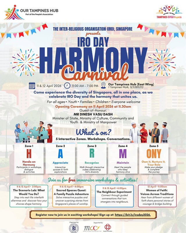 The Inter-Religious Organisation,  Singapore (IRO) is holding its inaugural IRO Day Harmony Carnival at Our Tampines Hub on 11-12 April.