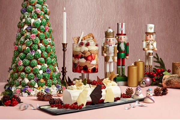 Desserts bring a whimsical touch with a festive “Christmas Tree” Croquembouche, Gingerbread Trifle, Snowman Pavlova, and Red Velvet Yule Log Cake